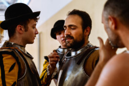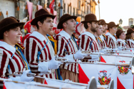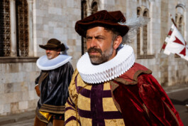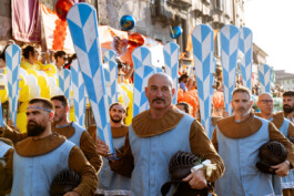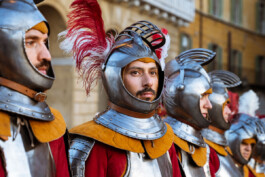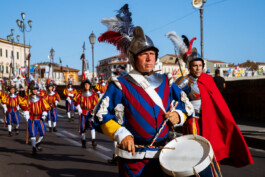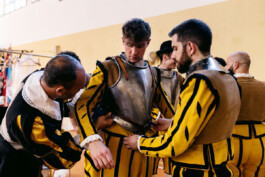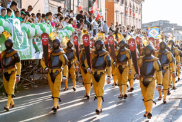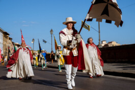 The Gioco del Ponte is an historical reenactment held every June in the town of Pisa (IT) on the Ponte di Mezzo, where the city’s two rival factions, Mezzogiorno and Tramontana, divided by the Arno River. The origins of the Game are linked to the Mazzascudo, an ancient military tournament established by the Republic of Pisa in the Middle Ages to train young men for war. In it, two factions (Gallo and Gazza), made up of armed companies, would engage in ritual combat using maces and shields. The armor was elaborate, and the goal was to conquer the opponent’s territory. Nowdays, the Gioco del Ponte is celebrated with a historical parade featuring over 700 participants, and a symbolic battle held on the Ponte di Mezzo, where the rival factions clash by pushing a cart.